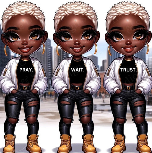 Pray. Wait. Trust. Chibi Girl Clip Art – Faith-Inspired Digital Download